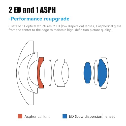 【Komfortables Aufnahmeerlebnis】:Es verfügt über 1 Stück asphärisches Glas und 2 ED-Linsen, um die HD-Bildqualität von der Mitte bis zu den Rändern zu erhalten, was den Blendschutz und den Anti-Purple-Rand verbessert. Die kürzeste Fokussierungsdistanz beträgt nur 0,15 m, und das Gewicht von nur 603 g kann sehr bequem sein, um kreative Spezialeffekte zu erstellen