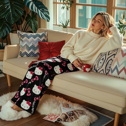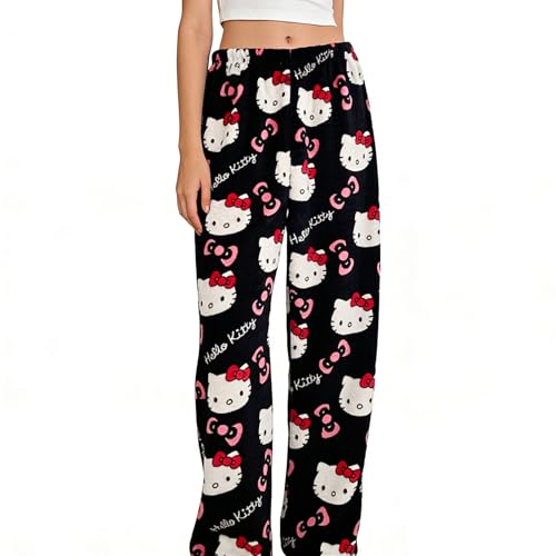 Anime Pyjama Hose Damen, leichte Lounge Hose, Anime Pyjamahose, Komfortable Schlafhose mit Elastikbund, Schwarz Rosa, EU Größen