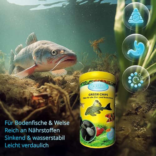 AQUARIS Green Chips Aquarium Fischfutter für Welse 120 g, 250 ml. Fischfutter für Welse und Bodenfische. Wird leicht absorbiert und trübt das Wasser Nicht. Komplettfutter für eine gesunde Entwicklung