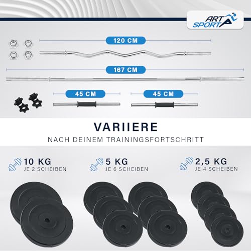 ArtSport Hanteln Set – Hanteln 3in1 60 kg mit 2 Kurzhanteln, Langhantel & SZ Curlhantel, 12 Gewichte mit Sternverschlüssen für Krafttraining