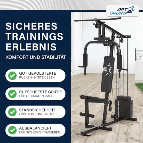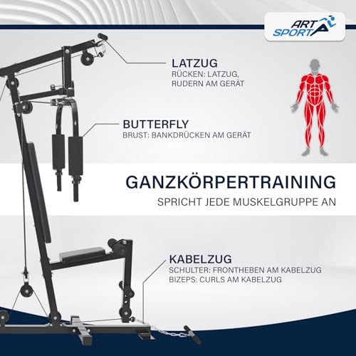 ArtSport Kraftstation ProfiGym 2000 mit Latzug- & Butterflystange, Seilzug & Beinstrecker – 9 Gewichte mit 40kg – Multistation Krafttraining Zuhause