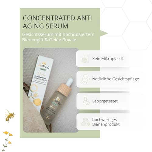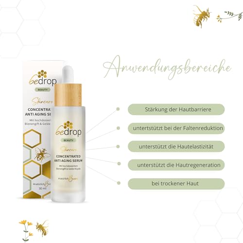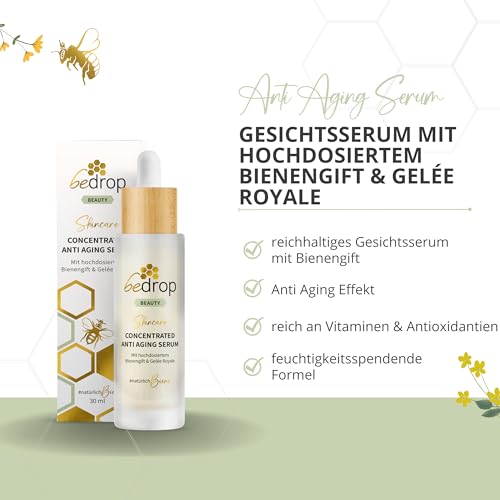 bedrop Concentrated Anti Aging Serum mit straffendem Bienengift, GelĂ©e Royal, Hyaluron & Acetylglucosamin hochdosiert – Reine Imker QualitĂ€t ohne Zusatzstoffe