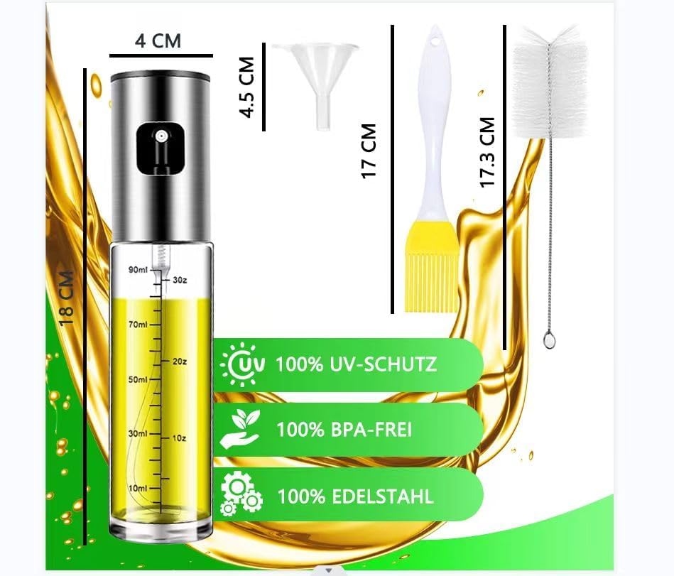 ✔️【Multifunktionales verstärktes Design】Dieser Sprüher kann mit Olivenöl, Sonnenblumenöl, Essig und mehr gefüllt werden. Perfekt zum Braten, Sautieren und Backen. Die fortschrittliche fächerförmige Düse liefert eine präzise Ölmenge, um die tägliche Kalorienzufuhr zu kontrollieren, indem sie etwa 1 Gramm Speiseöl pro Anwendung versprüht. Die Flasche ist verdickt und verstärkt, um das Risiko eines Bruchs zu verringern.