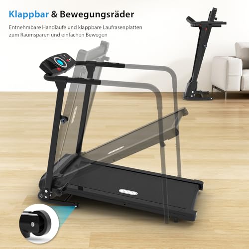 【Klappbar & Transportrollen】Die Lauffläche dieses klappbaren Laufbands kann angehoben und seine Handläufe können abgenommen werden, was den Platzbedarf bei Nichtgebrauch erheblich reduziert. Der Klappvorgang ist einfach und erfordert weder viele Werkzeuge noch die Hilfe anderer Personen. Zusätzlich ist das Geh-Laufband mit Rädern an der Vorderseite ausgestattet, sodass auch ältere Menschen das Laufband allein an jede gewünschte Position bewegen können.