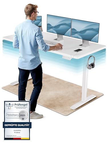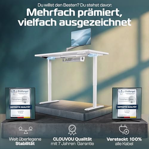 VIELFACH PRÄMIERT – Clouvous elektrisch höhenverstellbarer Schreibtisch ProDesk überzeugt mit ultraleiser 60mm/s Höhenverstellung, Handy-Ladefunktion, 120kg Tragkraft und intelligentem Kabelmanagement.