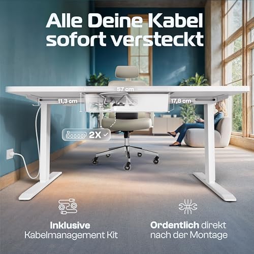 VERSTECKT ALLE KABEL – Ein höhenverstellbarer Tisch, der mitdenkt: Simpel & schnell verschwindet alles im edlen Kabelversteck und lässt den Bürotisch höhenverstellbar eingestellt sauber glänzen.