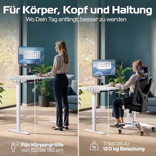 EXTRA STANDFEST – Der Bürotisch glänzt auch als Standing Desk wackelfrei und macht Schreibtische & Arbeitsplätze zur ergonomischen Oase, um den Rücken zu stärken. Tisch höhenverstellbar bis 120cm.