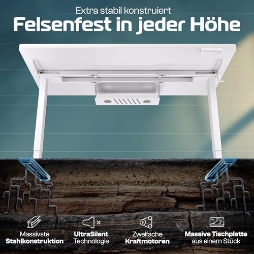 ABSOLUT LEISE – Zwei besonders starke Motoren machen den Tisch höhenverstellbar und sorgen dafür, dass Clouvous verstellbarer Schreibtisch extrem leise auf jede Büro Tisch Stufe fährt.
