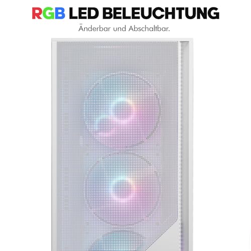 Individuelle Farbgestaltung möglich – Das Gehäuse ist weiß mit einer RGB Beleuchtung, sowie vier RGB-LED-Lüfter. Die Beleuchtung kann über die RGB Steuerung am PC geändert oder ausgeschaltet werden