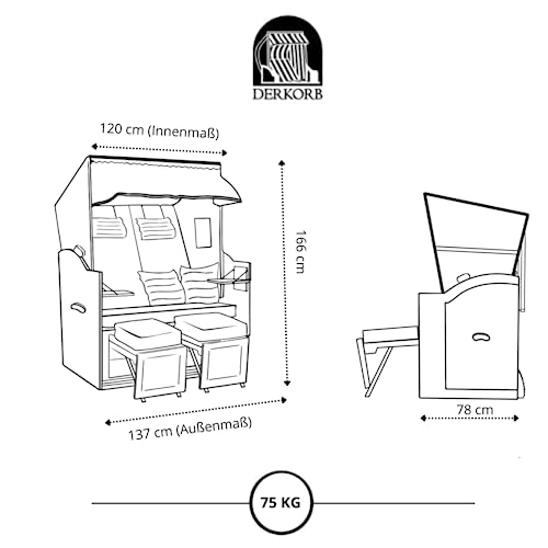 Details: DERKORB Strandkorb 2 Sitzer Ostsee XXL Volllieger, fertig montiert mit Rollen, 137cm breit, ideal fรผr Garten Terrasse Balkon