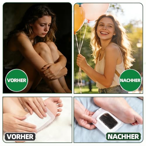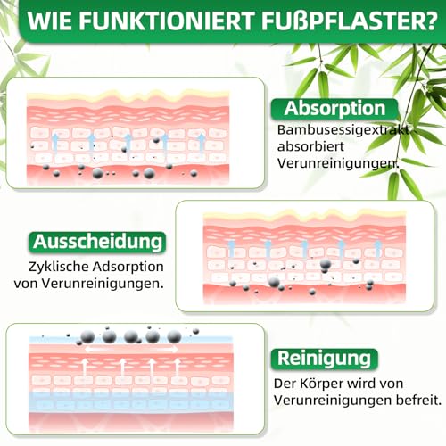 100 % natürlich: Die detox fußpflaster der Fußpflaster sind verschiedene natürliche Pflanzenextrakte, darunter Bambuskohle. Die natürlichen Reinigungspflaster gewährleisten Sicherheit und Verträglichkeit und bieten eine sanfte und reizfreie Anwendung für Ihre Füße.