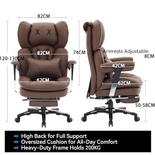 Efomao Bürostuhl, X-Stickerei Big and Tall Stuhl aus PU Leder für Zuhause, Verstellbarer Hochlehner Computer Gaming Stuhl, 200 kg drehbarer Chefsessel mit Fußstütze und Lendenwirbelstütze, Braun