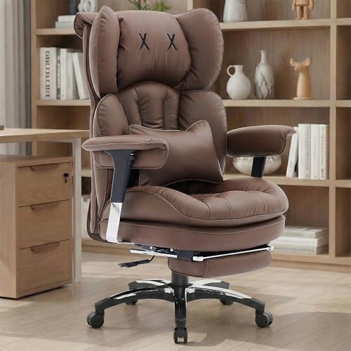 Details: Efomao Bürostuhl, X-Stickerei Big and Tall Stuhl aus PU Leder für Zuhause, Verstellbarer Hochlehner Computer Gaming Stuhl, 200 kg drehbarer Chefsessel mit Fußstütze und Lendenwirbelstütze, Braun