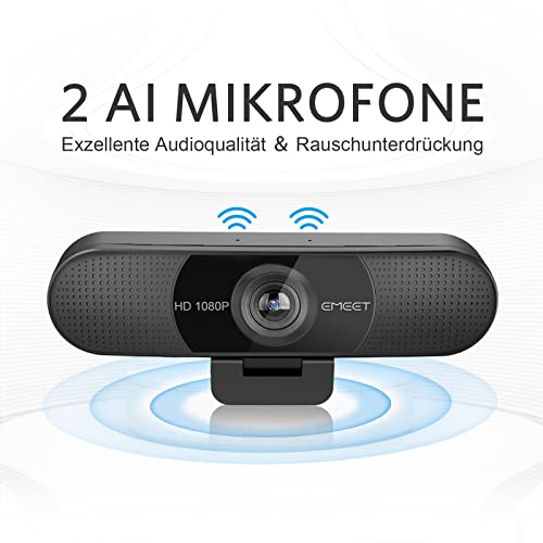 EMEET Full HD Webcam – C960 1080P Webcam mit Objektivabdeckung & Dual Mikrofon, 90 ° Streaming Kamera mit Automatische Lichtkorrektur, Plug & Play, für Linux, Win10, Mac OS