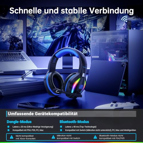 🔄 【Vielseitige Kompatibilität für jeden Einsatz】Das gaming headset wireless verbindet sich mühelos mit PC, Mac, Switch und Laptops über den zuverlässigen 2,4-GHz-Dongle. Für unterwegs wechseln Sie einfach auf das bluetooth headset und koppeln es mit Smartphones, Tablets oder iPads. 🚫 Nicht kompatibel mit Xbox. ⚠️ Das headset mit mikrofon funktioniert nicht auf Switch. 🚫 Bluetooth-Modus nicht kompatibel mit PS4 und PS5.
