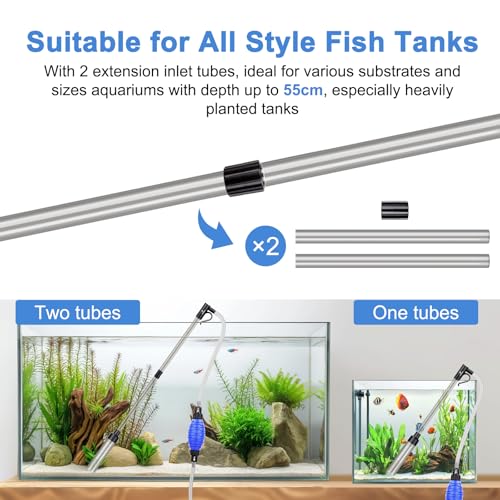 🐠🍀【Geeignet für alle Arten von Aquarien】Zwei abnehmbare Verlängerungsrohre mit einem Durchmesser von 1,5 cm werden mit dem Kit geliefert, um die Gesamtlänge des Aquariumsaugers zu verlängern, was bedeutet, dass Sie leicht in alle kleinen und tiefen Ecken gelangen können, um den Aquarienreiniger zu reinigen. Ideal für verschiedene Substrate und Beckengrößen, insbesondere für stark bepflanzte Becken und kleine/mittlere Aquarien mit einer Tiefe von weniger als 55 cm.