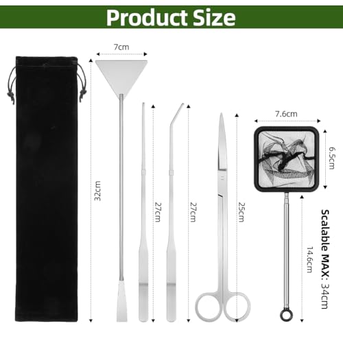 【7-in-1-AQUARIUM-WERKZEUG-SET】 Das Aquascape-Reinigungsset enthält alle wichtigen Werkzeuge für die Aquarienpflanzenpflege. Enthält 1 flache Sandschaufel (32 cm), 1 gebogene Schere (25 cm), 1 gebogene Pinzette (27 cm), 1 gerade Pinzette (27 cm), 80 pH-Teststreifen und 1 Netzbeutel. Im Lieferumfang ist eine schlichte und ansprechende Brillentasche enthalten, die eine einfache und übersichtliche Aufbewahrung ermöglicht.