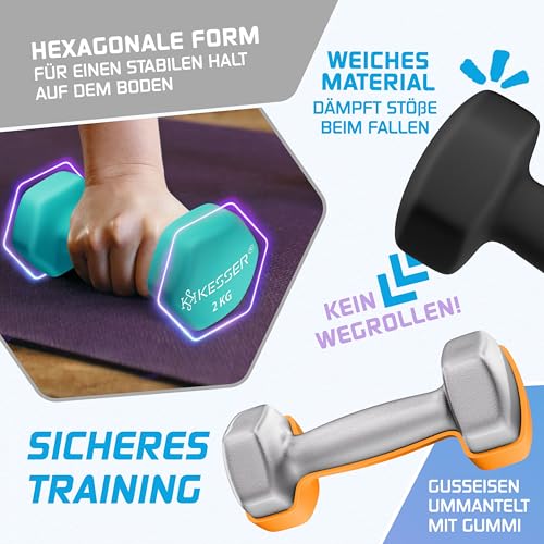 Details: KESSERยฎ Hantel-Set, 3 Paar, 1kg – 5kg, 12kg oder 18kg kurzhanteln mit Stรคnder Aufbewahrung, Fitnessstudio, Krafttraining, Hantelset rutschfeste Neopren, Mit รbungsheft, 2x Fitnessbรคnder