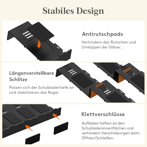 Rutschsicheres Design: Die Oberfläche jedes Gewürze Organizers ist mit einem rutschfesten EVA-Aufkleber versehen, der das Wegrollen der Gewürzflaschen verhindert. Zusätzlich können Sie die mitgelieferten Klebestreifen nutzen, um den Organizer sicher in der Schublade zu befestigen und ein Verrutschen beim Öffnen oder Schließen zu vermeiden