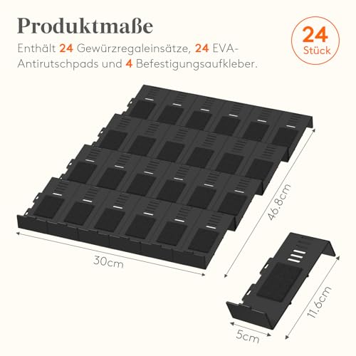 Modulares Design: Dieser Gewürz Organizer für Schubladen besteht aus 24 einzelnen schräg angeordneten Modulen, die jeweils 12 x 5 x 2,5 cm messen und einen eigenen Platz für jede Gewürzflasche bieten. Bitte messen Sie vorab Ihre Schublade, um sicherzustellen, dass die Innenhöhe mindestens 7,5 cm beträgt, damit die meisten Gewürzflaschen hineinpassen