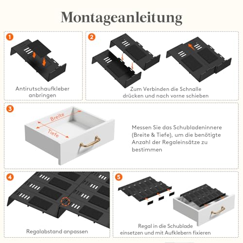 Flexibel & Anpassbar: Jedes Element des Gewürzregal Schubladensystems ist mit Verbindungsclips ausgestattet, mit denen Sie die Breite jeder Reihe durch horizontales Verbinden individuell einstellen können. Die verschiedenen Positionen der oberen Löcher ermöglichen eine maßgeschneiderte Tiefeneinstellung für unterschiedliche Schubladen und Gewürzflaschen