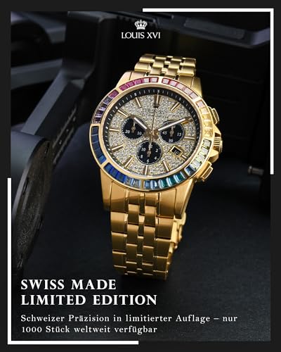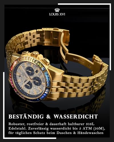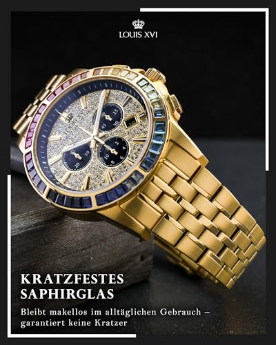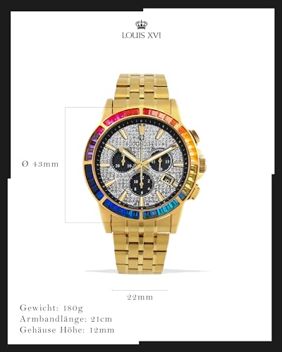 Details: LOUIS XVI Herren-Armbanduhr Majesté Iced Out Stahlband Silber/Gold CZ-Diamanten Chronograph Analog Quarz Edelstahl