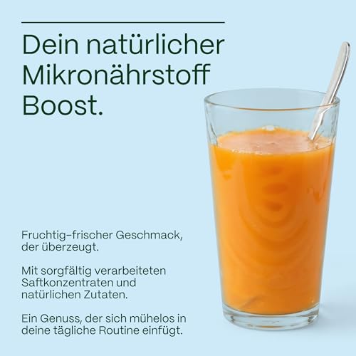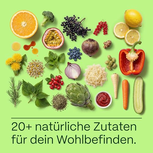 𝗙𝗥𝗨𝗖𝗛𝗧𝗜𝗚𝗘 𝗩𝗜𝗘𝗟𝗙𝗔𝗟𝗧 𝗔𝗨𝗦 𝗙𝗥𝗨𝗖𝗛𝗧 & 𝗚𝗘𝗠Ü𝗦𝗘: Mit wertvollen Konzentraten aus Orange, Passionsfrucht, Zitrone, Holunderbeere, Johannisbeere, Heidelbeere sowie Rote Bete, Karotte, Pastinake, Gurke, Zwiebel, Paprika, Sauerkraut, Tomate, Brokkoli (als Extrakt) und Topinambur.
