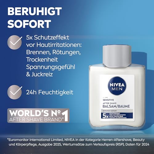 LIEFERUMFANG & DETAILS – NIVEA MEN Sensitive After Shave Balsam, 100 ml, beruhigende Gesichtspflege nach der Rasur für Männer, After Shave Lotion für empfindliche Haut, Artikelnr. 81306