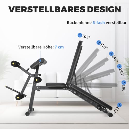 VERSTELLBARES DESIGN – Ausgestattet mit einer Rückenlehne, die in mehreren Stufen verstellbar ist, sowie einem kissen mit höhenverstellbarer Funktion. Mit 5 Verstellöffnungen ermöglicht die Rückenlehne eine einfache Anpassung in 5 Winkellagen. Außerdem kann die Rückenlehne ohne die Verwendung einer Öffnung einen bestimmten Neigungswinkel einnehmen. Das Kissen bietet eine Höhenverstellung von 70 mm und passt sich so verschiedenen Trainingsanforderungen an.