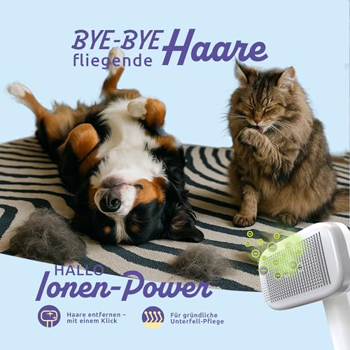 ELEKTRISCHE TIERHAARBÜRSTE MIT IONEN-FUNKTION: Der integrierte Doppel-Ionen-Generator neutralisiert statische Aufladung und pflegt das Fell glänzend und sauber.