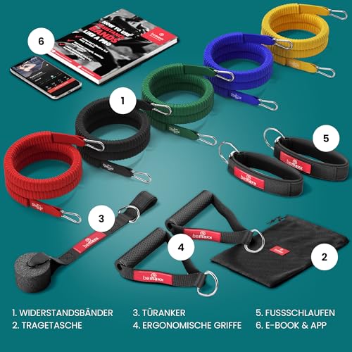 Details: Resistance Bands Widerstandsband Set mit Trainings-eBook – Expander Tubes Bänder Band Fitnessbänder – Widerstandsbandset: 5 Widerstandsbänder, Griffe, Türanker, Fußschlaufen | Fitnessband Fitness