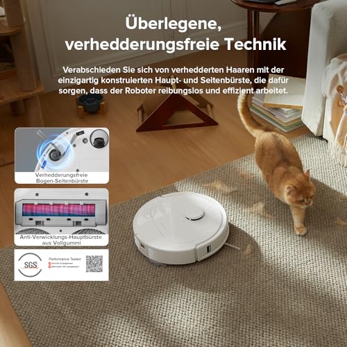Verhedderungsfreies Bürstensystem: Die verbesserte asymmetrische Seitenbürste ist SGS-zertifiziert für eine 0 % Haarverwicklungsrate, während die spiralförmige Vollgummibürste effektiv verhindert, dass Haare und Schmutz sich darin verfangen. Perfekt für Haushalte mit Haustieren oder langen Haaren – verabschieden Sie sich von Haarverwicklungen mit diesem innovativen Saugroboter.