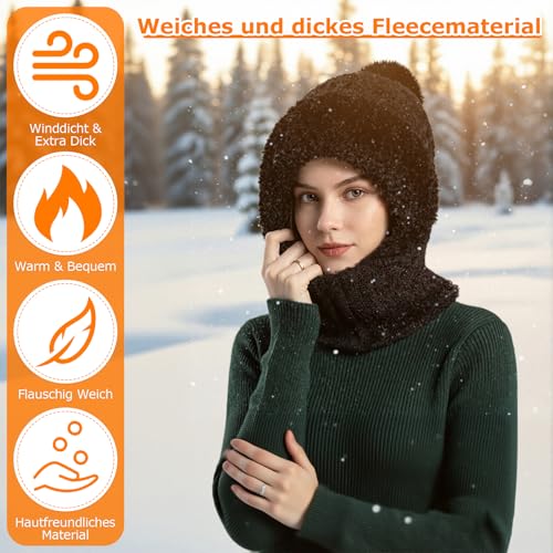 Details: Schalmütze Damen, Balaclava Strickmütze, Multifunktional Sturmhaube, 3-in-1-Beanie Mütze Gesichtsmaske und Schal Fleecegefüttert Winddicht Mütze, Winter Thermo Kapuzenschal, Mützenschal