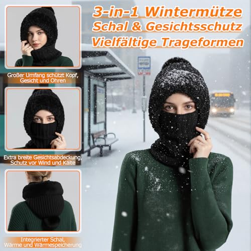 Schalmütze Damen, Balaclava Strickmütze, Multifunktional Sturmhaube, 3-in-1-Beanie Mütze Gesichtsmaske und Schal Fleecegefüttert Winddicht Mütze, Winter Thermo Kapuzenschal, Mützenschal