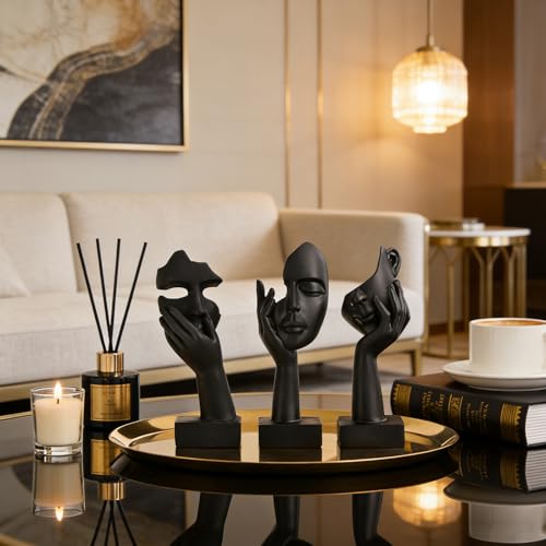 MATERIAL | GRÖSSE – Die weiblichen Gesichtsstatuen in Schwarzgold sind aus Harz gefertigt. Dieses Set aus drei verschiedenen Posen (15,2 cm, 16,7 cm, 16,2 cm H) mit einheitlichen 5,3 cm W-Profilen. Ihre absichtlich abwechslungsreichen Höhen schaffen dynamische Tiefe auf Regalen oder Schreibtischen, während kompakte Formen überlagerte Texturen verstärken und kühne abstrakte Kunst in kompakter Form hervorheben