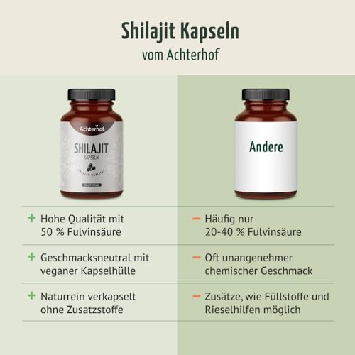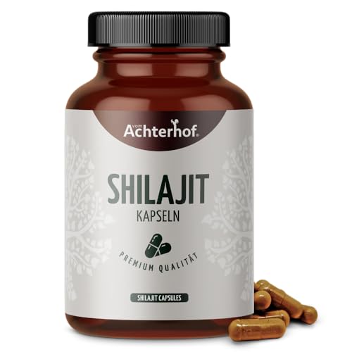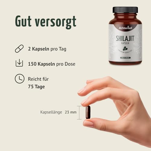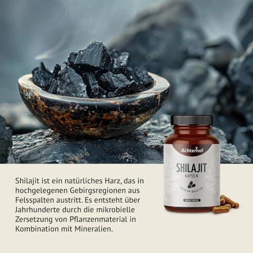 Shilajit Kapseln 150 Stück | 100% reines Mumijo Shilajit | aus dem Himalaya Gebirge | mit 50% Fulvinsäure und 12% Huminsäure | geschmacksneutral | Achterhof