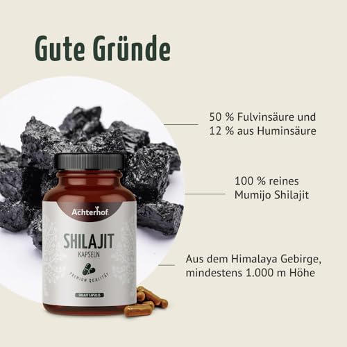 Details: Shilajit Kapseln 150 Stück | 100% reines Mumijo Shilajit | aus dem Himalaya Gebirge | mit 50% Fulvinsäure und 12% Huminsäure | geschmacksneutral | Achterhof