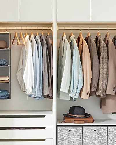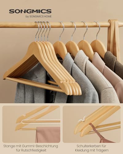 Details: SONGMICS Kleiderbügel Holz, 20er Set, Bügel aus Massivholz, Einkerbungen im Schulterbereich, rutschfester Hosensteg, um 360° drehbarer Haken, für Anzüge, Hemden, naturfarben-silbern CRW001-20