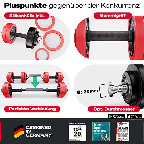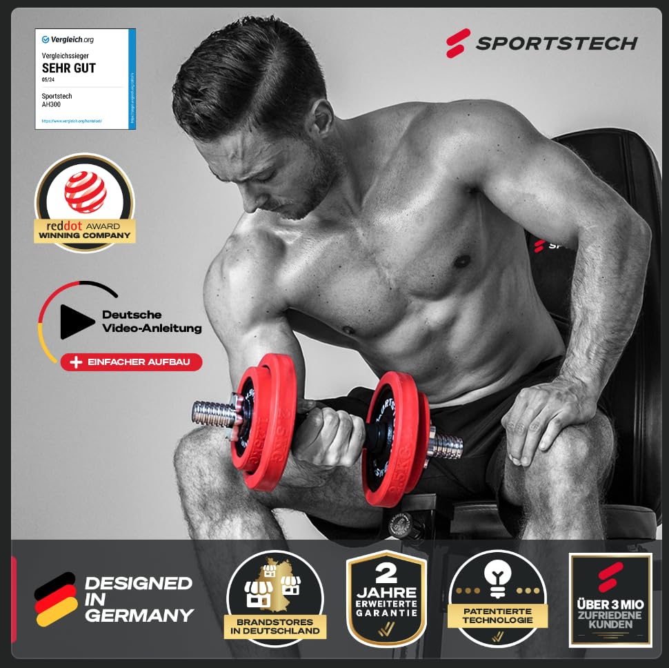 Details: Sportstech 2in1 Hantelset mit Silikonüberzug, Deutsche Qualitätsmarke, Kurzhanteln & Langhantel in einem, Hanteln mit 20kg/30kg aus Gusseisen, effektives Fitness Krafttraining, AH300, Vergleichssieger