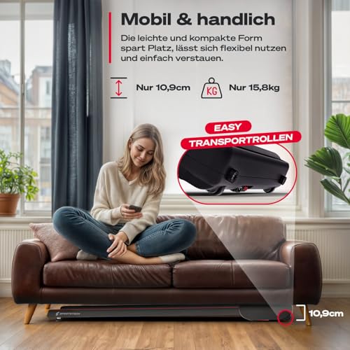 ✅ 𝗞𝗢𝗠𝗣𝗔𝗞𝗧𝗘𝗦 & 𝗣𝗟𝗔𝗧𝗭𝗦𝗣𝗔𝗥𝗘𝗡𝗗𝗘𝗦 𝗗𝗘𝗦𝗜𝗚𝗡 – Das flache Walking Pad passt mühelos unter den Schreibtisch, die Couch oder an die Wand. So bringst du Bewegung selbst in kleine Räume – egal ob im Büro oder zu Hause. Perfekt für alle, die trotz wenig Platz aktiv bleiben und ihr Sportgerät Zuhause optimal nutzen möchten.
