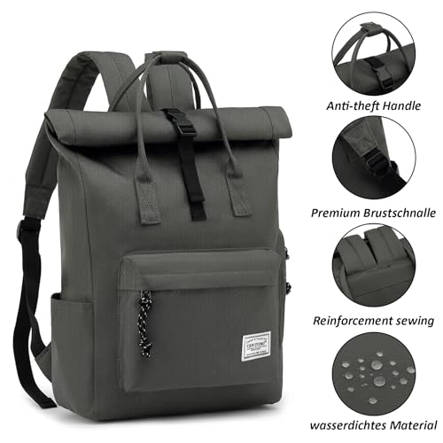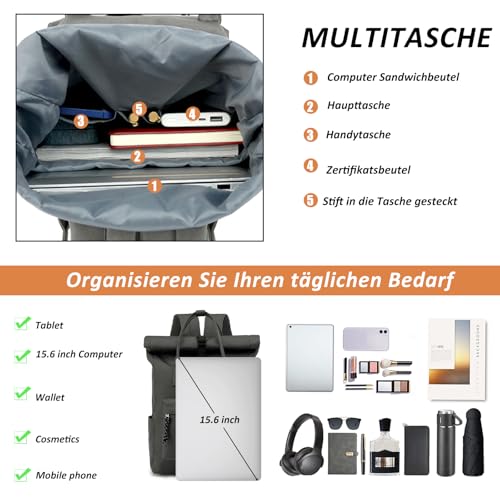 Details: TANTOMI Laptop Rucksack, Rucksack Laptop Tasche 15,6 Zoll, Rucksack Damen und Herren weit öffenbar, Rolltop Rucksack wasserdicht, Backpack Daypack für Schule, Fahrradfahren, Freizeit und Reise
