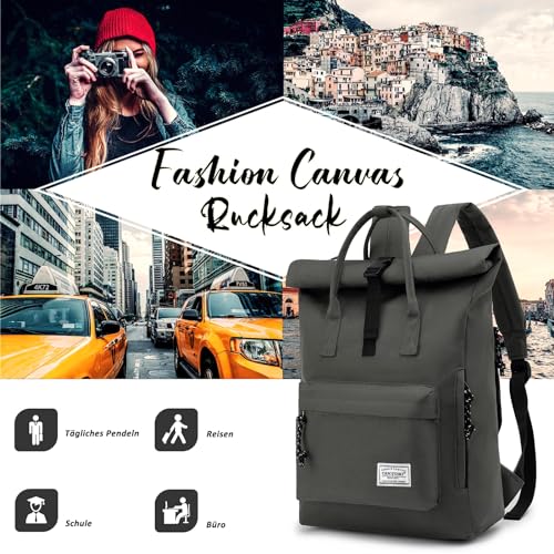 TANTOMI Laptop Rucksack, Rucksack Laptop Tasche 15,6 Zoll, Rucksack Damen und Herren weit öffenbar, Rolltop Rucksack wasserdicht, Backpack Daypack für Schule, Fahrradfahren, Freizeit und Reise