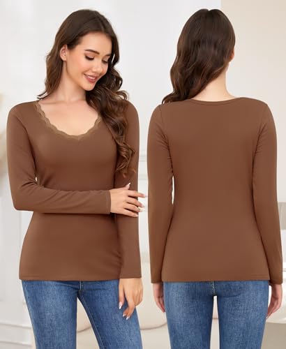 Details: Thermounterwäsche Damen Langarmshirt Thermo Unterwäsche Basic Thermoshirt Thermo Oberteil Spitze V-Ausschnitt Thermowäsche Unterhemd Langarm Thermal Innenfleece Winter Shirt