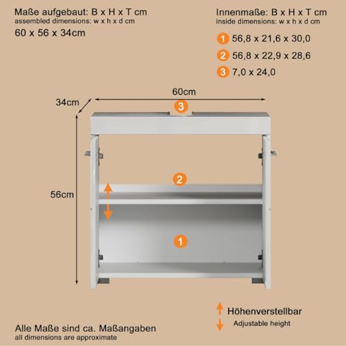 Platzsparende und funktionale Lösung – Mit den Maßen (BxHxT) 60 x 56 x 34 cm passt er unter gängige Waschtische und eignet sich hervorragend für kleine bis mittelgroße Bäder; kompakt