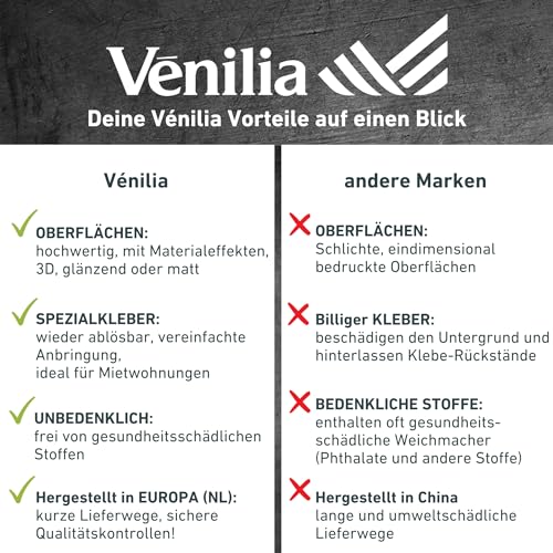 GROSSE AUSWAHL an DESIGNS: Venilia ist Ihr Experte in Sachen Innenausstattung seit 1874 Wir bieten eine große Auswahl an Designs für unsere selbstklebenden Folien, darunter Holz, Marmor, Stein, Blumen und vieles mehr Egal welchen Stil Sie bevorzugen, wir haben sicher das passende Design für Sie