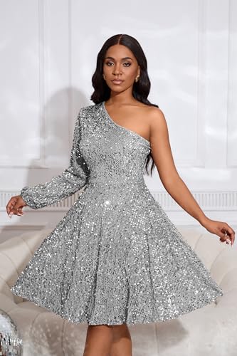 VERWIN Damen-Skaterkleid mit Pailletten, eine Schulter, langärmelig, ärmellos, Midi, glitzernd, lässig, Party, Cocktail