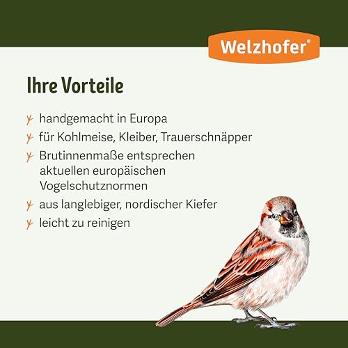 Details: Welzhofer Nistkasten Nancy, Vogelhaus mit 34mm Einflugloch, handgemacht in Europa, für Kohlmeisen, Kleiber, Trauerschnäpper, Haus- & Feldsperlinge & Gartenrotschwänze, katzensicheres Vogelhaus