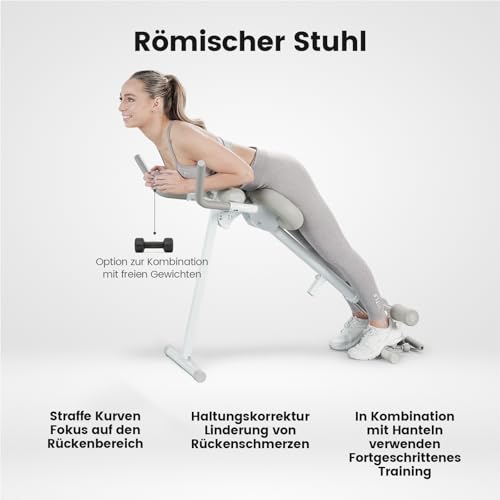 Roman Chair Modus: Er wurde entwickelt, um Ihre Bauchmuskulatur, den unteren Rücken, die seitlichen Bauchmuskeln, die Gesäßmuskeln und die hinteren Oberschenkelmuskeln zu trainieren. Passen Sie die Intensität an Ihre Fitnessstufe an und erhöhen Sie sie, indem Sie zusätzliche Gewichte und Hanteln verwenden. Sie können Ihre Workout-Übungen auf die nächste Stufe heben, wann immer Sie bereit sind, die Herausforderung anzunehmen. Es ist ein hervorragendes Werkzeug sowohl für Anfänger als auch für fortgeschrittene Athleten.